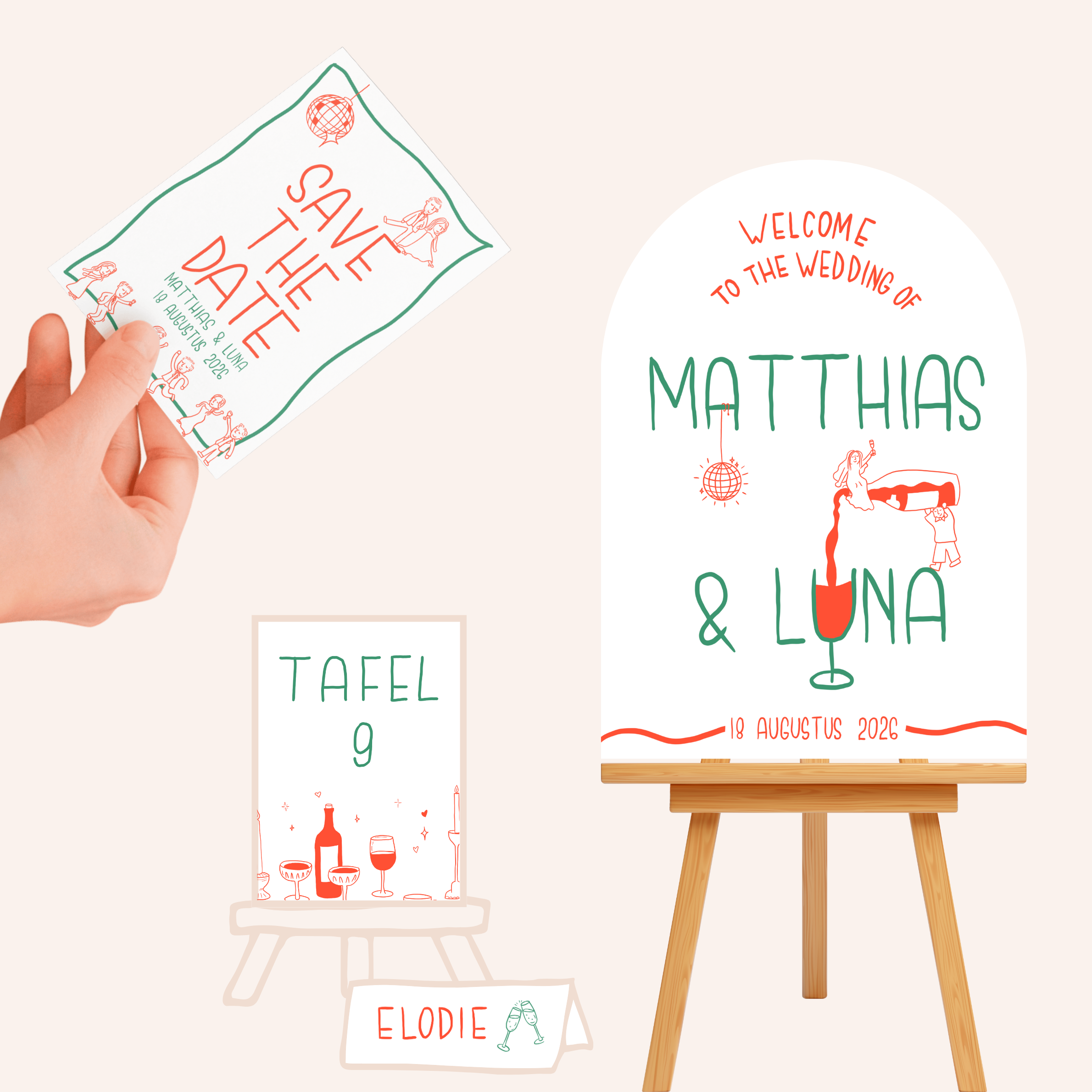 Denk aan uitnodigingen, tafelplannen, naamkaartjes en nog veel meer – alles in één stijl en volledig op maat gemaakt.