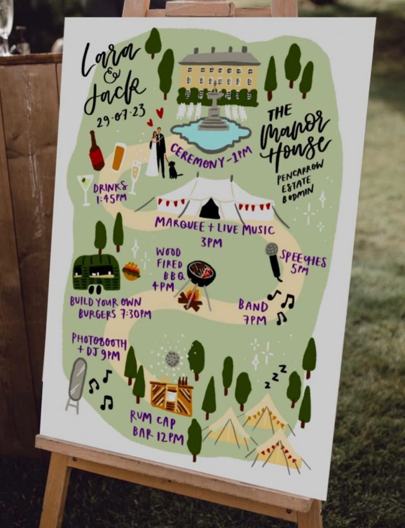 Naast mijn live illustraties bied ik ook grafisch ontwerp op maat aan voor evenementen. Denk aan het ontwerpen van uitnodigingen, het vormgeven van tafelschikkingen en het creëren van gepersonaliseerde naamkaartjes. Ik zorg ervoor dat alle visuele elementen perfect op elkaar zijn afgestemd en één stijlvol geheel vormen.